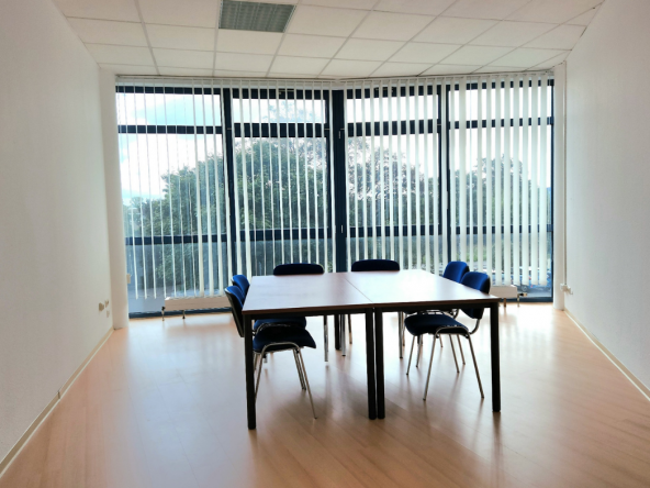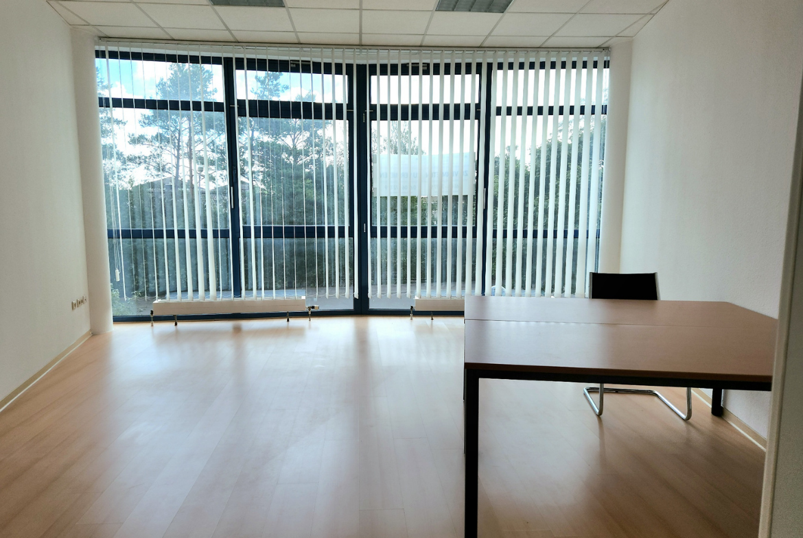 Ein Büro ist mit einer Teeküche ausgestattet. Die bodentiefen Fenster verfügen über Jalousien