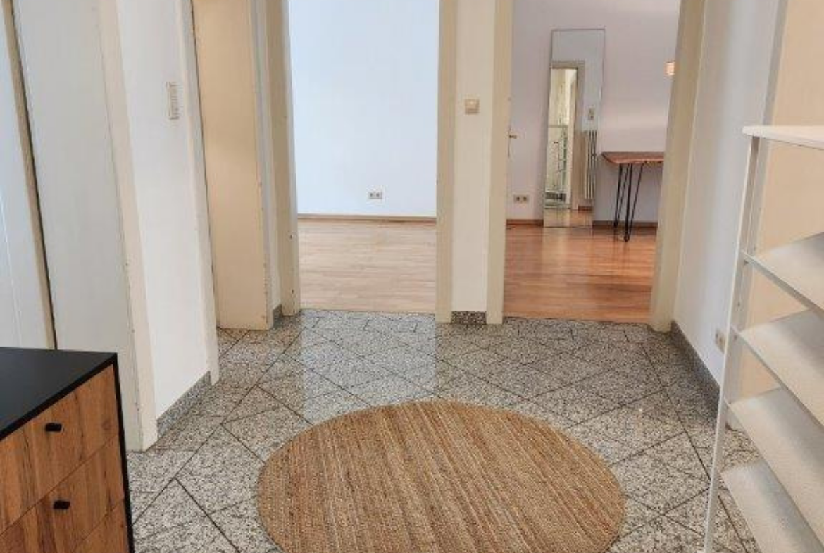 Der Flurbereich, der das Herz der Wohnung darstellt, sowie Küche und Tageslicht-Wannenbad sind gefliest. Das Wohnzimmer und die beiden weiteren Zimmer (Schlafzimmer + Ankleide-/Arbeitszimmer) sind mit hellem Parkett ausgelegt. Die Küche besitzt eine moderne EBK, die vom Mieter unentgeltlich